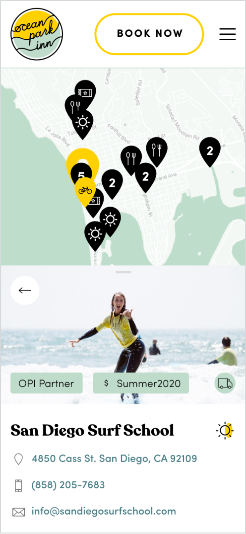 We implemented a branded theme on top of a custom Google Maps integration to highlight key San Diego spots for guests. We also included discount codes for places that have partnerships with Ocean Park Inn.